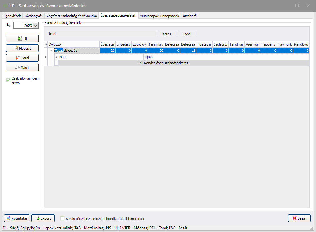Csak állományban lévők: Ha listázni kívánja a nem állományban lévő dolgozók szabadságkereteit is, deaktiválja a kapcsolót! -