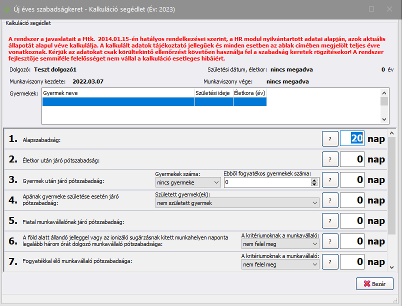 Fontos! A rendszer javaslatait a Mtk. 2014.01.15-én hatályos rendelkezései szerint, a HR modul nyilvántartott adatai alapján, azok aktuális állapotát alapul véve kalkulálja. A kalkulált adatok tájékoztató jellegűek és minden esetben az ablak címében megjelölt teljes évre vonatkoznak. Kérjük, az adatokat csak körültekintő ellenőrzést követően használja fel a szabadságkeretek rögzítésekor! A rendszer fejlesztője semmiféle felelőséget nem vállal a kalkuláció esetleges hibáiért!