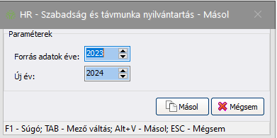Ennek a funkciónak a segítségével egy forrás év éves szabadságkereti másolhatóak át egy új év keretei közé. A másolás a teljes dolgozó törzset átmásolja. Gyorsítható az adminisztráció, a másolás után csak az esetleges változások rögzítése szükséges a kijelölt dolgozónál a