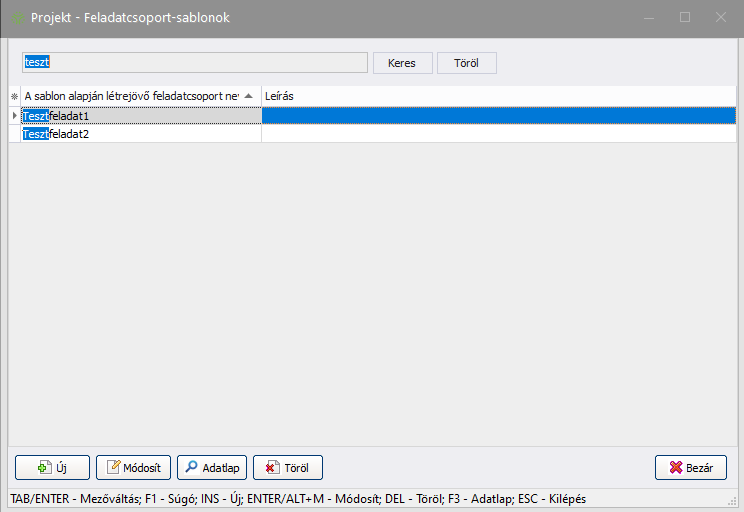 Ebben az ablakban a projektek feladatcsoport sablonjait láthatja listába rendezve. A feladatcsoport-sablonok feladatokból tevődnek össze. Az itt létrehozott feladatcsoportot egy projektsablon létrehozásakor fel tudja használni, de a projektsablon készítése folyamán létrehozott feladatcsoport ebben a listában is látható lesz.
