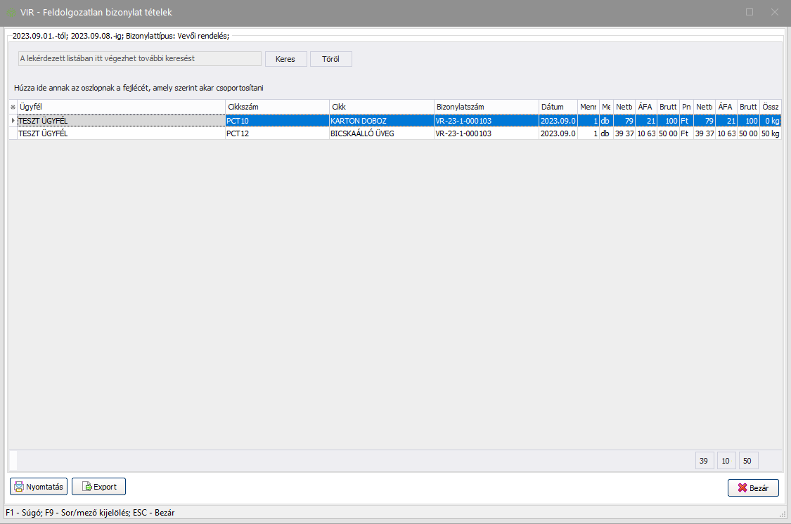 Elérése: VIR -> Feldolgozatlan bizonylat tételek