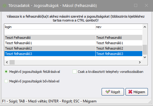 Felhasználó adott telephelyre beállított jogosultságainak másolása másik telephelyre: A megfelelő felhasználó és másolandó (forrás) telephely kiválasztása után kattintson a