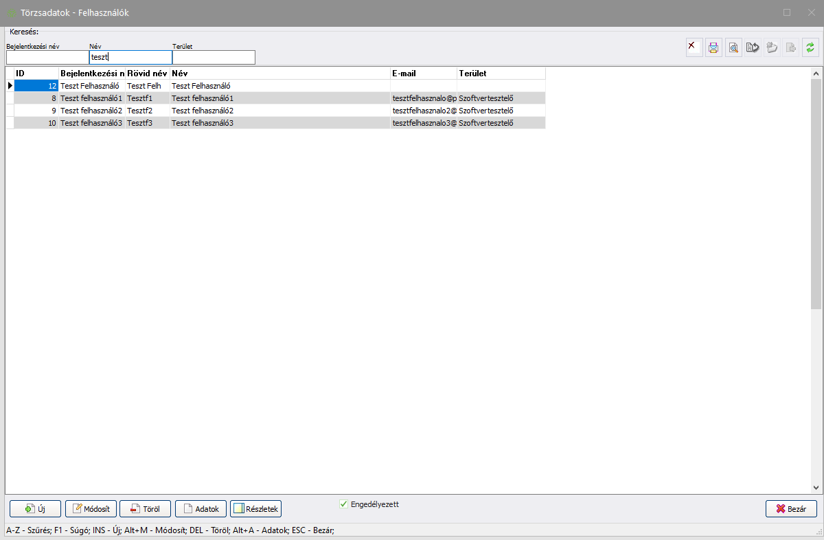 Egy, a rendszerben már rögzített felhasználó adatainak megtekintéséhez válassza ki (egy kattintással a megfelelő sorra) a felhasználót, majd nyomja meg az alsó gombsoron az