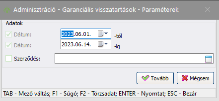 Ezzel a lekérdezéssel adott időszakra lehet akár az összes szerződés, akár egy kiválasztott szerződés vonatkozásában lekérdezni a lejáró visszatartásokat.