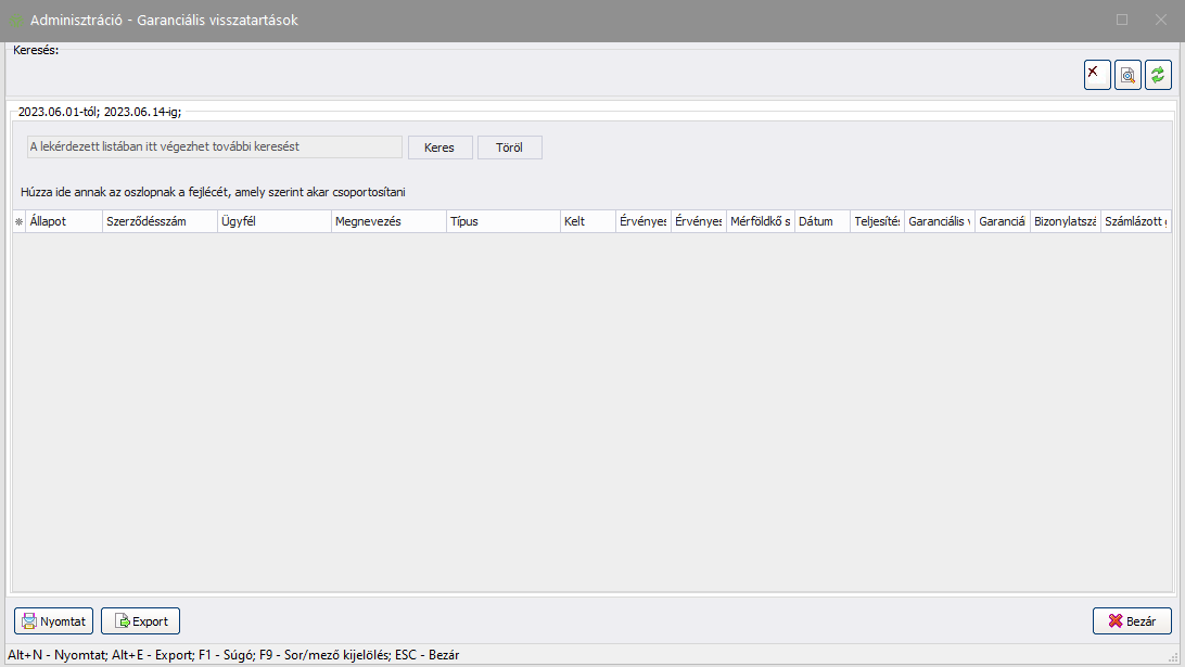Elérése: Adminisztráció -> Lekérdezések, listák -> Garanciális visszatartások