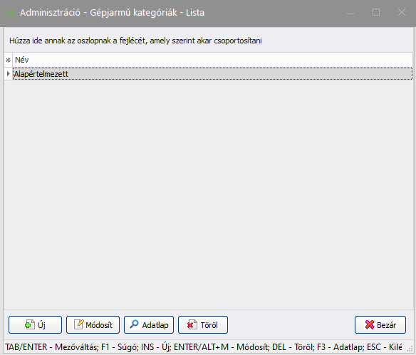 Elérése: Adminisztráció -> Gépjármű -> Gépjárműkategóriák törzs