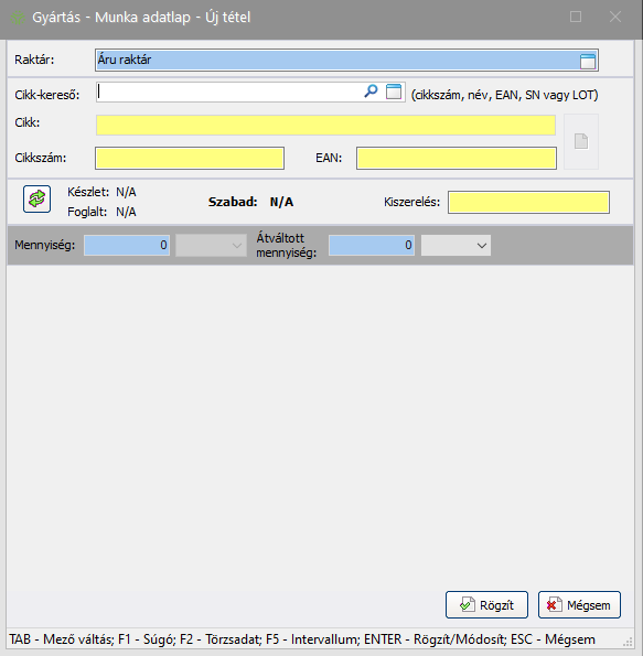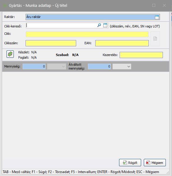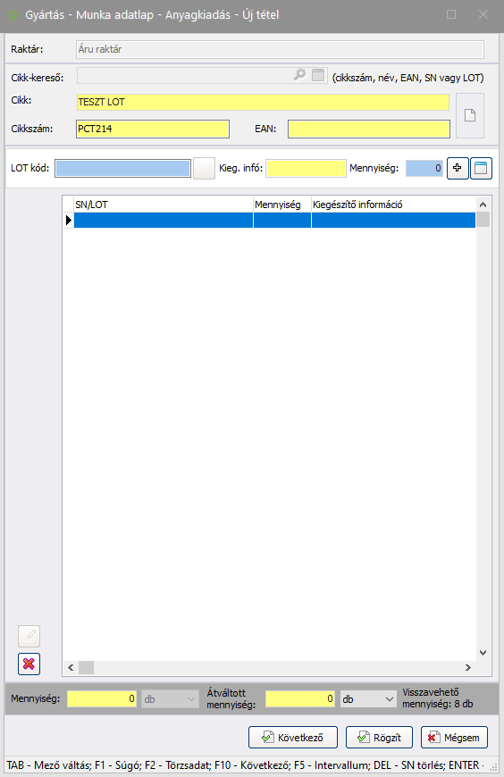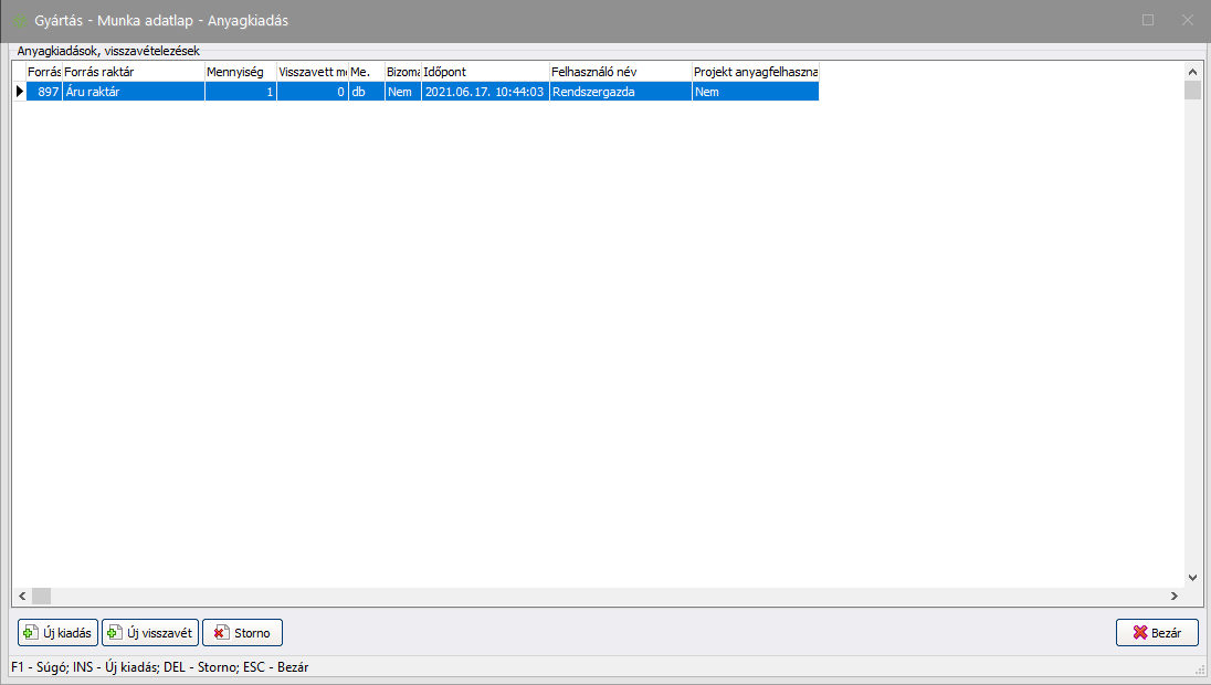 Fontos! A raktárról kiadott anyagok kivezetése az anyagkiadással még nem történik meg, csak foglalásba kerül a kiadott anyag mennyiség, így azzal további munkavégzés nem lehetséges. A tényleges anyagkiadás a gyártás zárásakor történik meg.