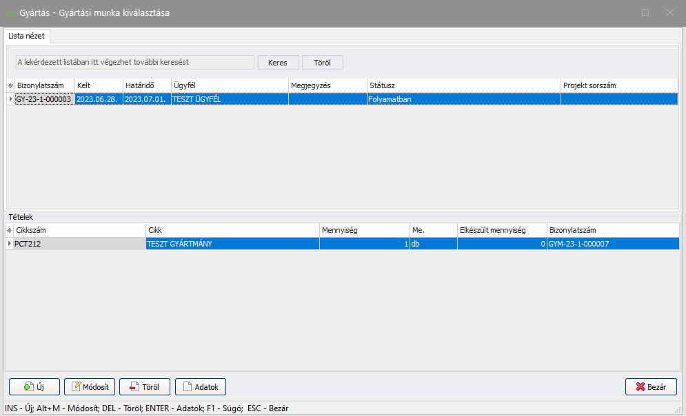 (Módosít): A gyártáshoz tartozó munka adatlap megnyitása szerkesztésre.