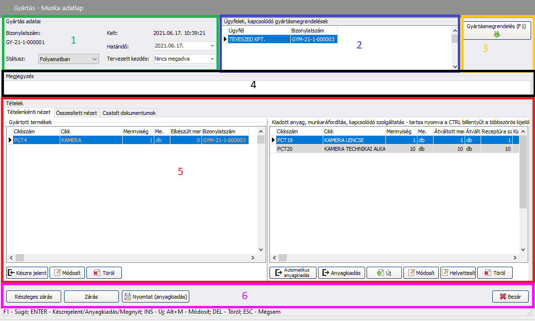- 5. A gyártandó termékek és a szükséges anyagokkal kapcsolatos információk és funkciók: Itt adminisztrálhatja többek között az anyagkiadást és a legyártott termékek készrejelentését, valamint dokumentumokat csatolhat az adatlaphoz. (Bővebben a Tételenkénti nézet, az Összesített nézet és a Csatolt dokumentumok c. fejezetekben.)