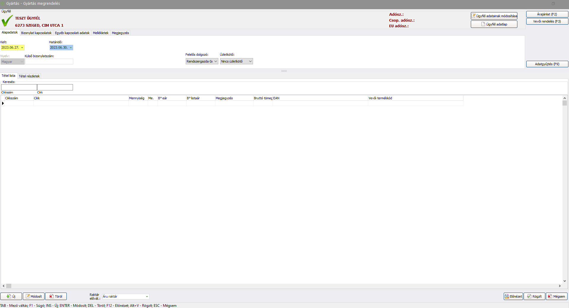 Ebben az ablakban van lehetősége a Gyártás megrendelés típusú bizonylatok karbantartására.