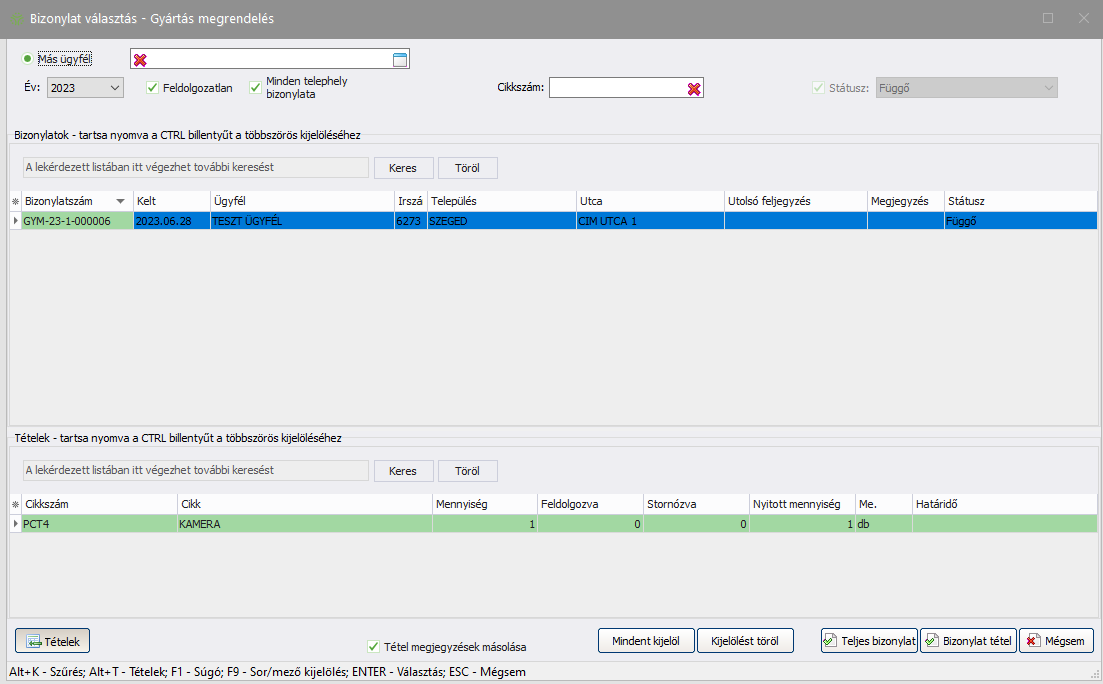 (Bizonylat tétel): A bizonylat kiválasztott tételének felvétele gyárthatóság ellenőrzésre.