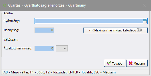 (<< Maximum mennyiség kalkuláció): A funkció kiszámítja, hogy a megadott gyártmányból; a raktáron rendelkezésre álló anyagok alapján; mennyi a maximálisan legyártható mennyiség és ezzel az értékkel tölti fel a Mennyiség mezőt.