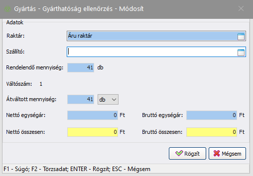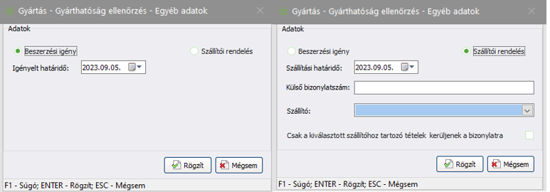 (Függő): Csak „Függő” státuszú bizonylatok adhatók át gyárthatóság ellenőrzésre. E beállítás nem módosítható!