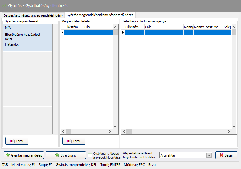 Elérése: Gyártás -> Gyárthatóság ellenőrzés -> Gyártás megrendelésenként részletező nézet (fül)