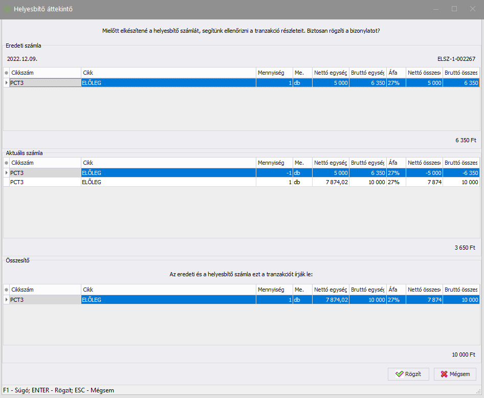 (Rögzít) gombra kattintva a rendszer a bizonylat rögzítése előtt egy áttekintő ablakot jelenít meg, mely segítségével ellenőrizhető a helyesbítéssel előálló adattartalom.