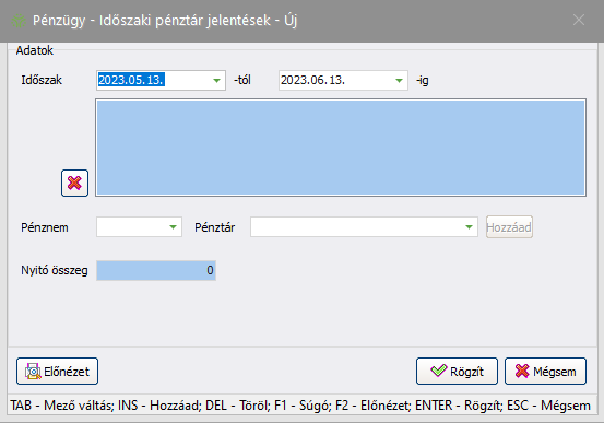 Ahhoz, hogy egy pénztárról időszaki pénztárjelentést tudjon készíteni, léteznie kell a rendszerben egy korábbi zárásnak az adott pénztárral.