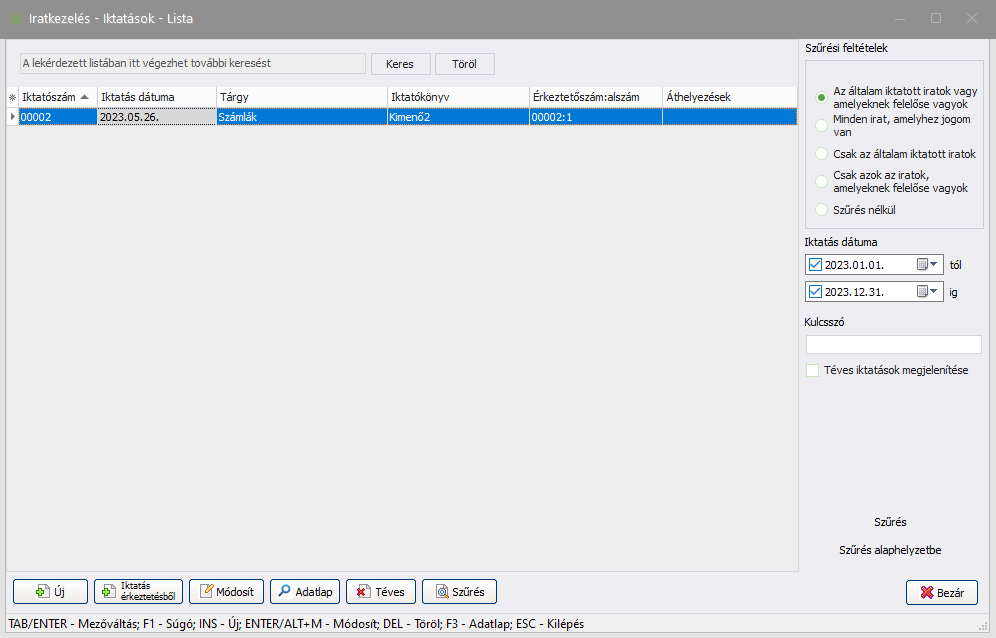(Téves): téves iktatás esetén használandó funkció. A gomb megnyomsáa után az iktatási tétel nem törlődik, csupán az alapértelmezett listában nem látszik, azonban a jobb oldali szűrési feltételek között az erre vonatkozó jelölő bejelőlésével újra megjelennek a listában.