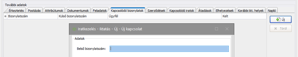 Belső bizonylatszám (az Europroof rendszerében korábban előállított bizonylat) segítségével kapcsolhat bizonylatokat az iktatáshoz.
