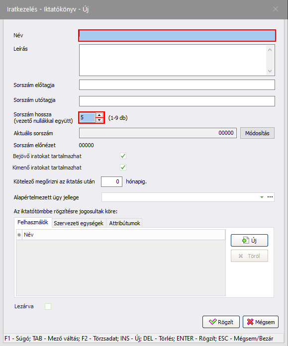 : Az alapértelemezett ügy jellegét válassza ki a legördülő listából vagy a szótárból. - Az iktatótömbbe rögzítésre jogosultak köréhez megadhat felhasználókat és szervezeti egységeket is, továbbá attribútumokat is.