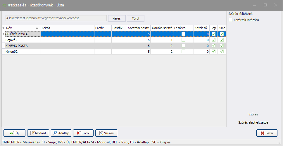 (Szűrés): szűrési feltételek megjelenítése az ablak jobb oldalán és szelektálás az iktatókönyvek között. Ha szeretné, hogy a lezárt iktatókönyvek is ki legyenek listázva, pipálja be a