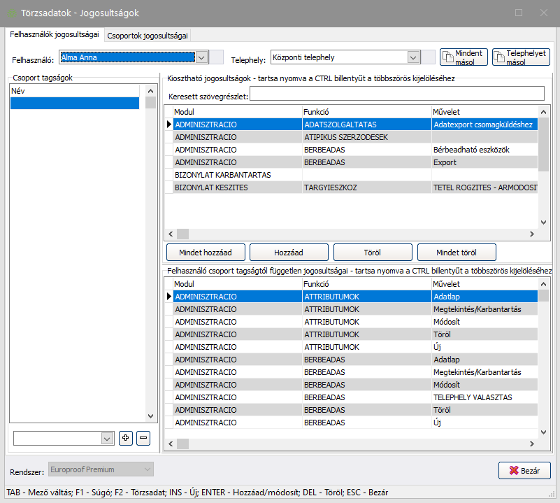 Elérése: Europroof -> Jogosultságok vagy Törzsadatok -> Jogosultságok