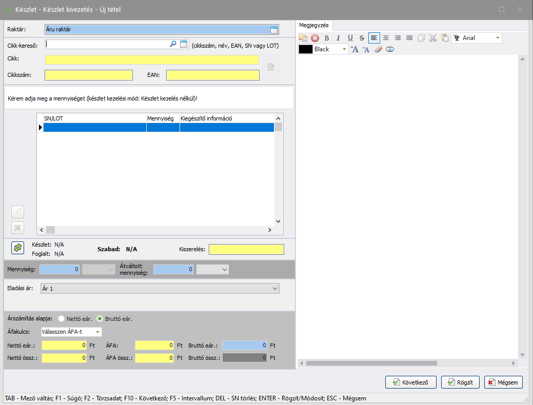 mezőbe a cikkhez tartozó megjegyzést. Ez a megjegyzés nem jelenik meg a bizonylaton. - Ha szeretné rögzíteni a tételt, kattintson a