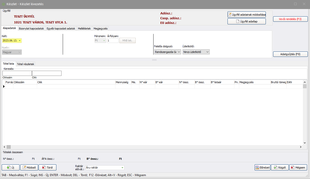 - Ha megadott minden szükséges adatot a fenti fülek segítségével, következhet a tételek hozzáadása a bizonylathoz.