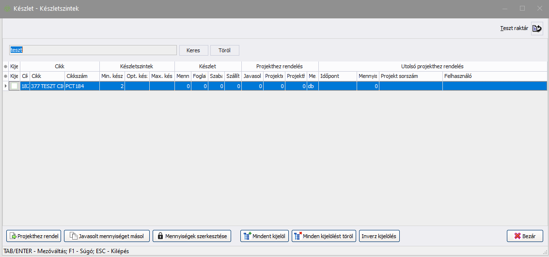 A készletszintek figyelésére van lehetőség azon cikkek esetében, melyek adatlapjain meg vannak adva a Készletszintek fülön a Minimum, maximum és optimális készletszint értékek. A listában azon cikkek jelennek meg, melyek esetében a szabad mennyiség és a szállítói rendelt mennyiség összege kisebb, mint a minimum készletszint.