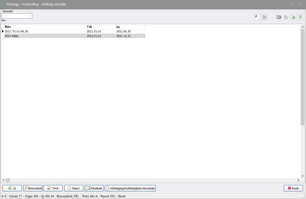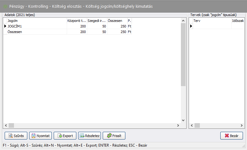Az adott időszak költség elosztásáról a költség jogcímek és költséghelyek alapján kimutatás készítése és az eredmények összehasonlítása a tervekkel. (A tervezésről bővebben a Tervezés c. fejezetben.)