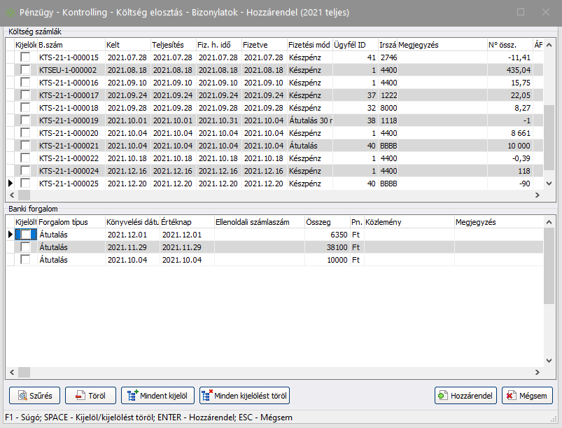 (Hozzárendel): A gomb segítségével rendelhet a költség elosztáshoz Bizonylatokat és banki forgalmat.
