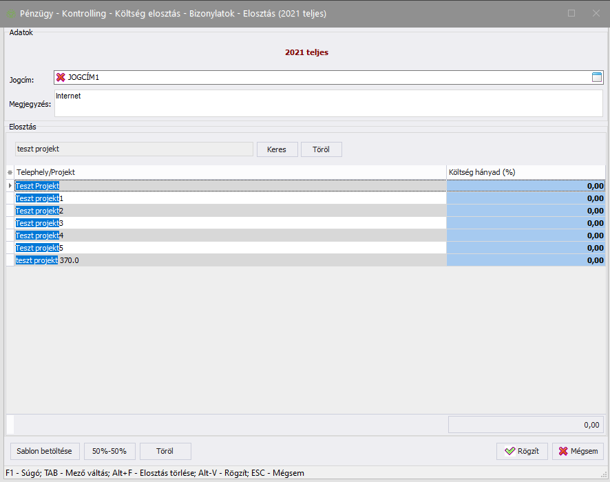 - A Felosztás: mezőben láthatja a Telephelyek közötti költségelosztást. (% ban)