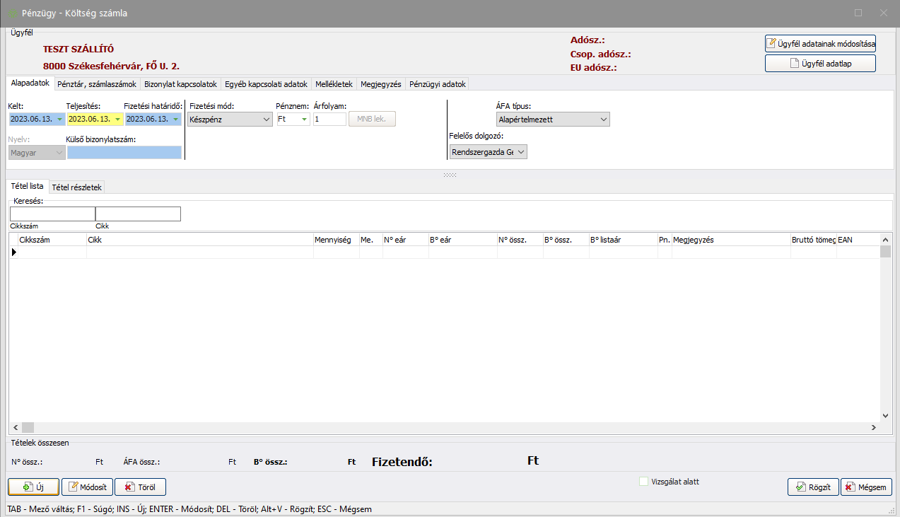 - Szállító: akinek a költség számláit rögzíteni kívánjuk, azaz a bizonylatok kiállítója. A Szállító mezőben található