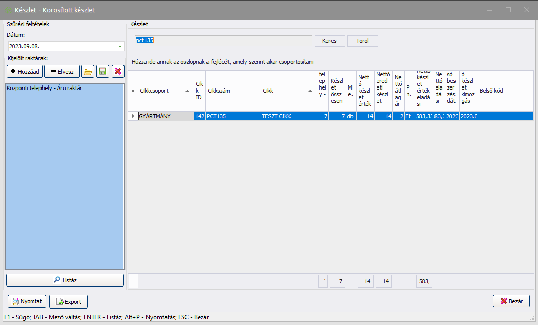 (Elvesz) gombokkal tudja a raktárakat kijelölni, mely raktárak esetében mutassa az adott dátumra vonatkozó készlet adatokat.