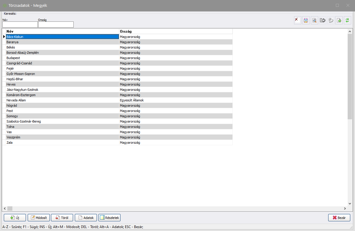 Elérése: Törzsadatok -> Egyéb -> Megyék