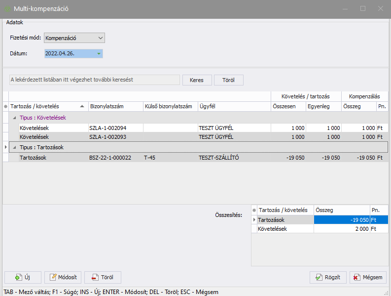 A Multi-kompenzáció ablak Összesítés része tartalmazza a Tartozások/követelések egyenlegét.