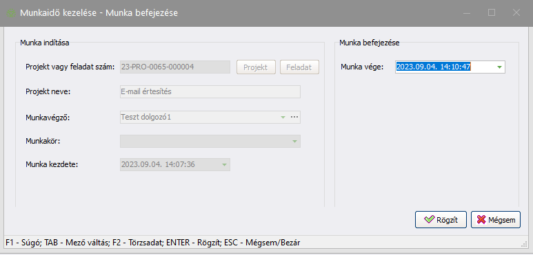 A Megállít gombbal a kijelölt munkaidőt lehet megállítani. Megállítás után a munkaidő a kiválasztott feladatra/projektre könyvelődik, annak adatlapján megtalálható a munkaidő rögzítés. A munka megállításánál csak a munka vége állítható be: