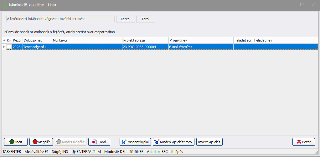 Az ablakban megjelenő lista tartalmazza a folyamatban lévő munkaidő rögzítéseket.