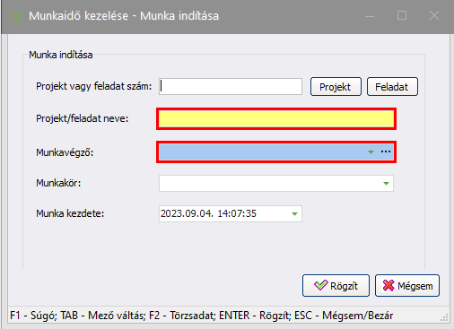 Új munkaidő indítható az Indít gombbal, ekkor az alábbi ablakban szükséges megadni/kiválasztani a projektet vagy feladatot, amire a munkaidőt fogja könyvelni a rendszer. Ki kell választani a munkavégzőt a dolgozók listájából. Megadható a munkakör, és beállítható a munka kezdete: