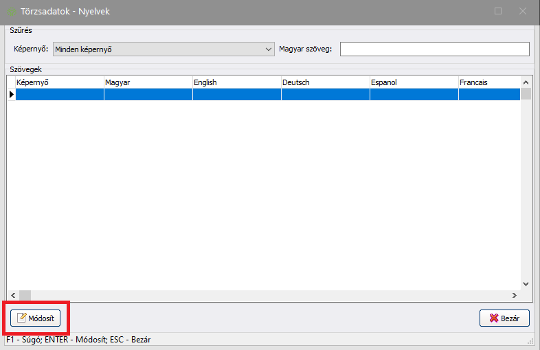 Ha egy megadott szöveget szeretne idegen nyelvre fordítani, kattintson duplán a megfelelő sorra, vagy kijelölés után nyomja meg a  (Módosít) gombot. Ha egy kifejezésnek megadta a kívánt (vagy akár az összes) nyelven a fordítását, rögzítse azt.