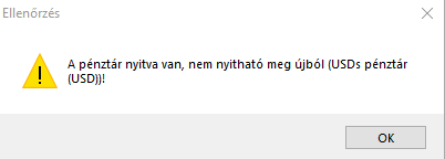 Amennyiben egy pénztár nyitva van, nem nyitható meg újból. Az alábbi tájékoztatás jelenik meg: