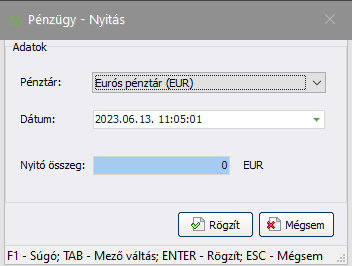 Ezzel a funkcióval lehetséges a kiválasztott Pénztár nyitása. Minden Pénztárat egy napon belül többször meg lehet nyitni, de a legelső nyitáskor adható meg annak nyitódátuma és nyitóösszege. A későbbi nyitások alkalmával az egyenleg már nem módosítható. A zárások egyenlege lesz a következő nyitás nyitóegyenlege.