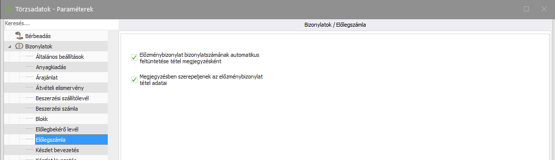 | Korábbi időszaki teljesítésű pénzügyi tételek rögzítése | Beállítása esetén: A rendszer üzenetet küld, ha a felhasználó olyan számlát rögzített a rendszerben, amely teljesítése az elmúlt hónapra esett. Az értesítő tartalmazza a bizonylat főbb adatait is. |