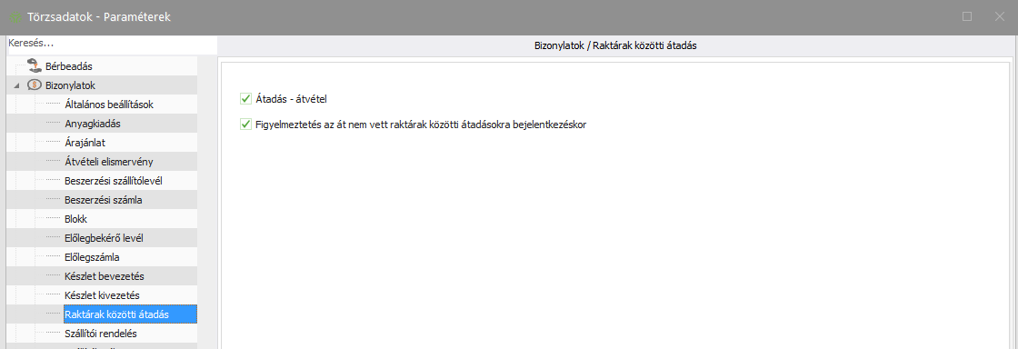 | Értesítés nyitott raktárak közötti átadásról X nap után | Beállítása esetén: A rendszer üzenetet küld a még X nap után is nyitott raktárak közötti átadásokról. |