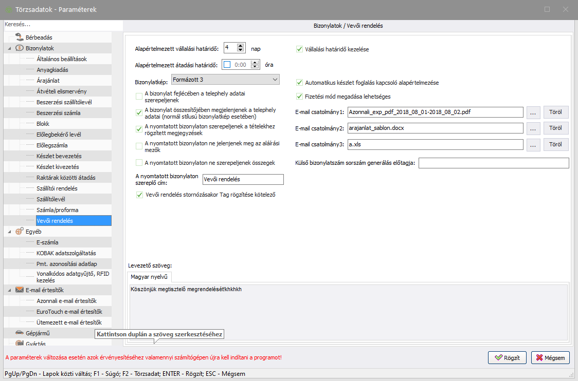 | Megrendelések | Beállítása esetén: A rendszer üzenet küld vevői rendelés bizonylat rögzítését követően annak főbb adataival |