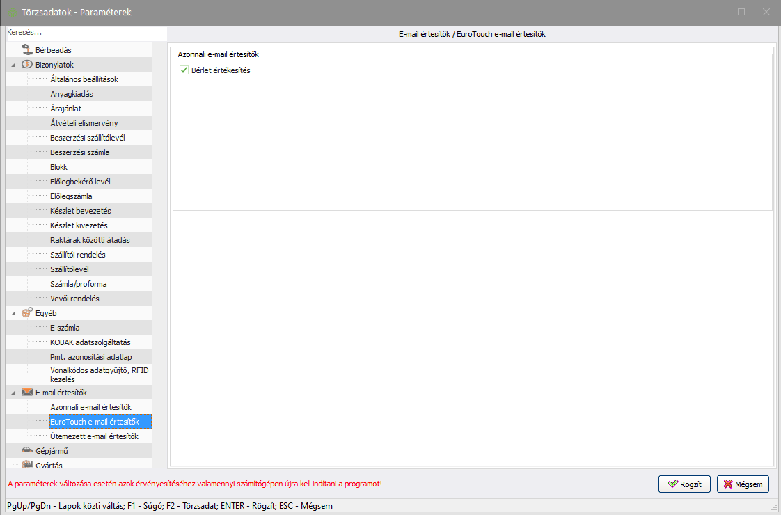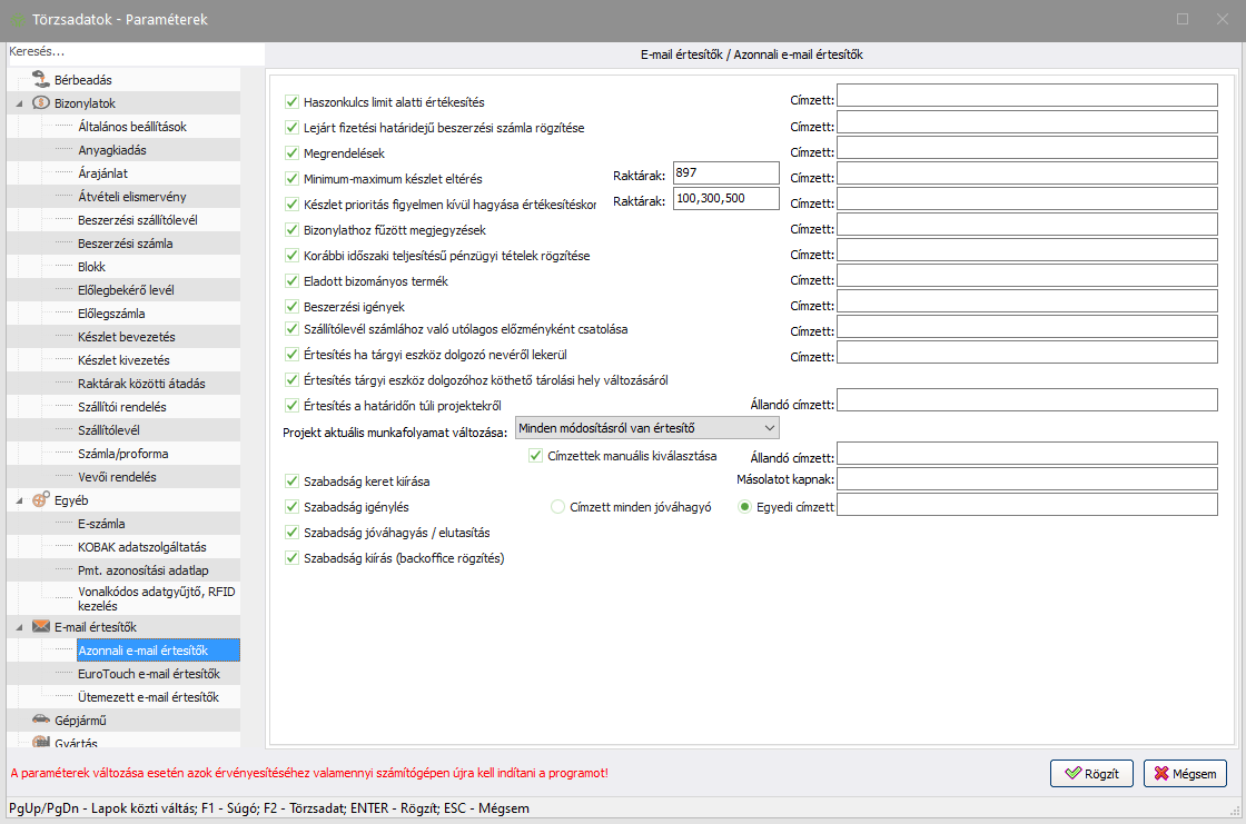 Elérése: Törzsadatok -> Paraméterek -> E-mail értesítők (fül) -> Azonnali e-mail értesítők (fül) vagy