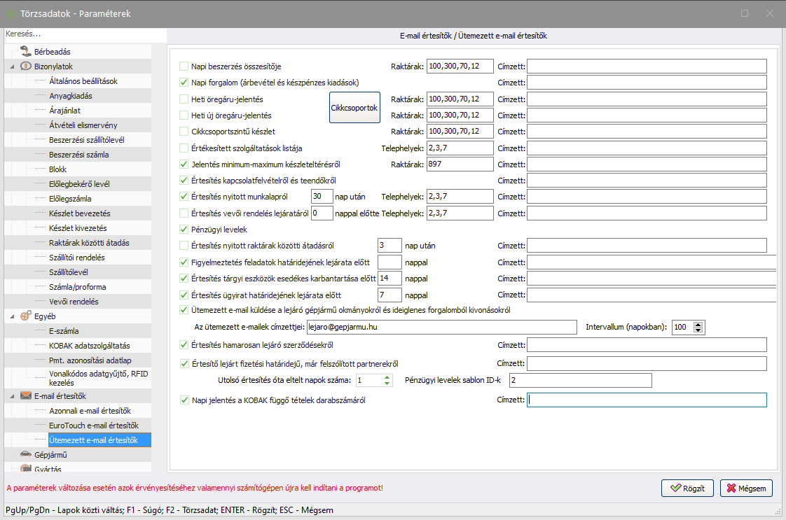 | Ütemezett e-mail küldése a lejáró gépjármű okmányokról és ideiglenes forgalomból kivonásokról  | Bejelölés esetén a rendszer e-mailt küld a címzetteknél megadott e-mail címekre azokról a lejáró okmányokról és ideiglenes forgalomból való kivonásokról, melyek lejárata belül esik az intervallumban megadott napokon. Csak a gépjárműhöz kapcsolt lejáró okmányok esetében küld e-mail értesítót a rendszer. A maximálisan megadható napok száma 100. |