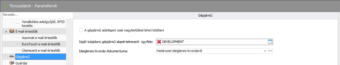 Elérése: Törzsadatok -> Paraméterek -> Gépjármű (fül) vagy