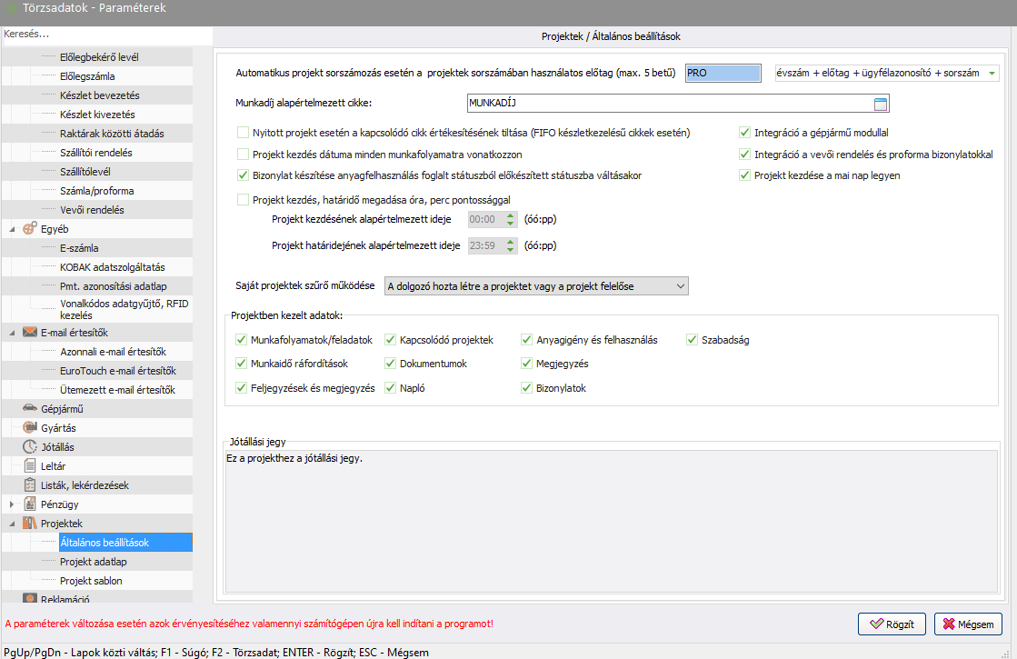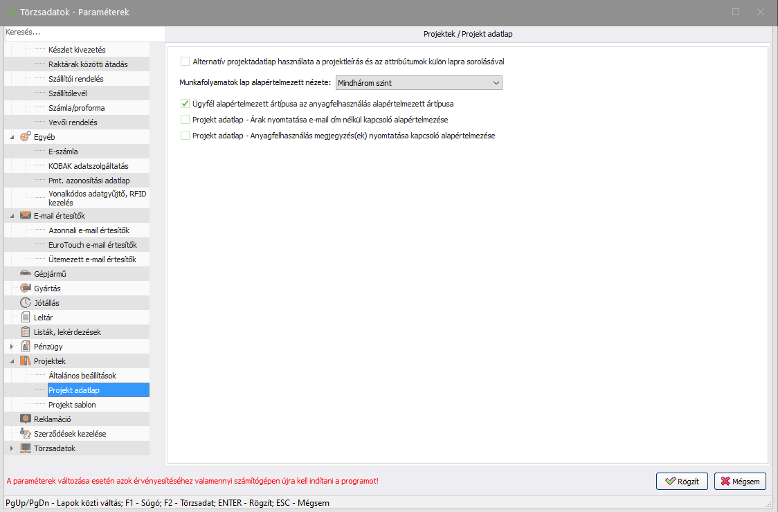 Elérése: Törzsadatok -> Paraméterek -> Projektek (fül) -> Projekt adatlap lap vagy