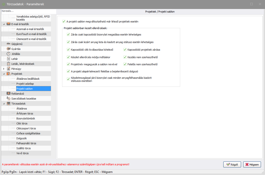 Elérése: Törzsadatok -> Paraméterek -> Projektek (fül) -> Projekt sablon lap vagy