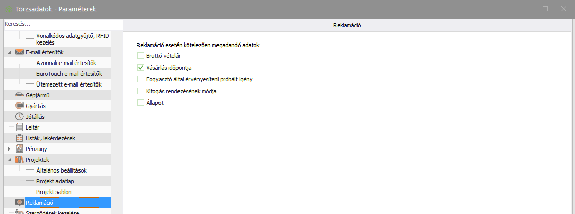 | Értesítés a határidőn túli projektekről | Bejelölése esetén e-mail értesítést kap a projekt felelőse a lejárt határidejű projektekről, minden nap, amíg a projekt lezárásra nem kerül, vagy a határideje nem módosul. A mezőben megadhatók egyéb fix címzettek is, pontosvesszővel elválasztva |
